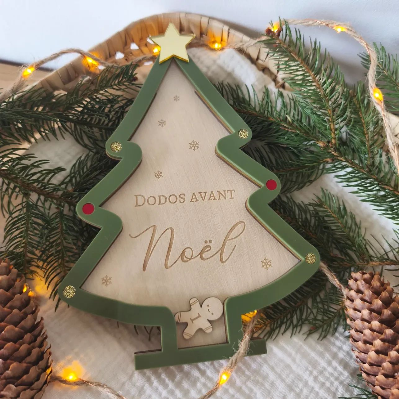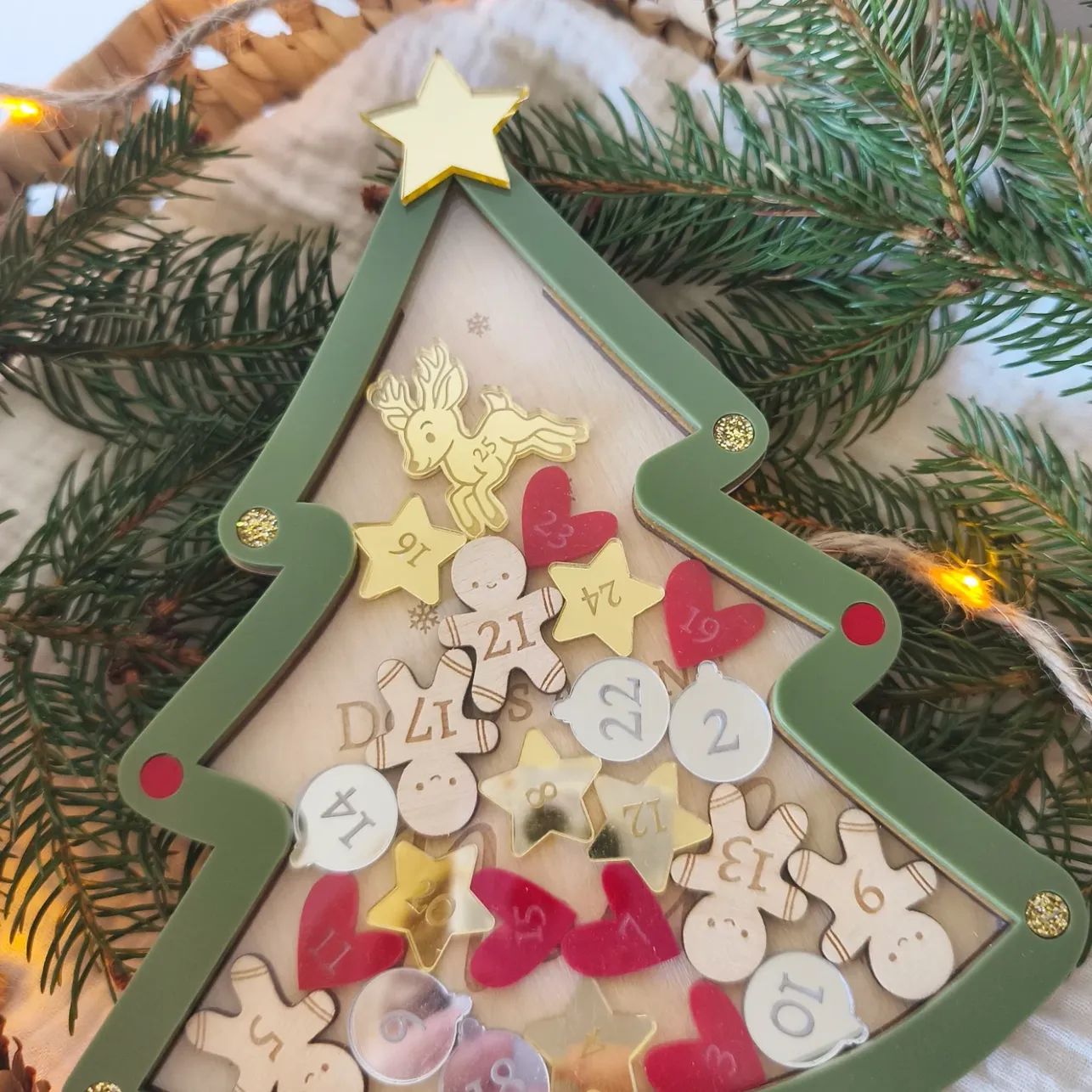 Chaque jour, tu pourras insérer une petite figurine (étoile, boule de noël, bonhomme pain d’épice et cœur) dans le sapin 💫