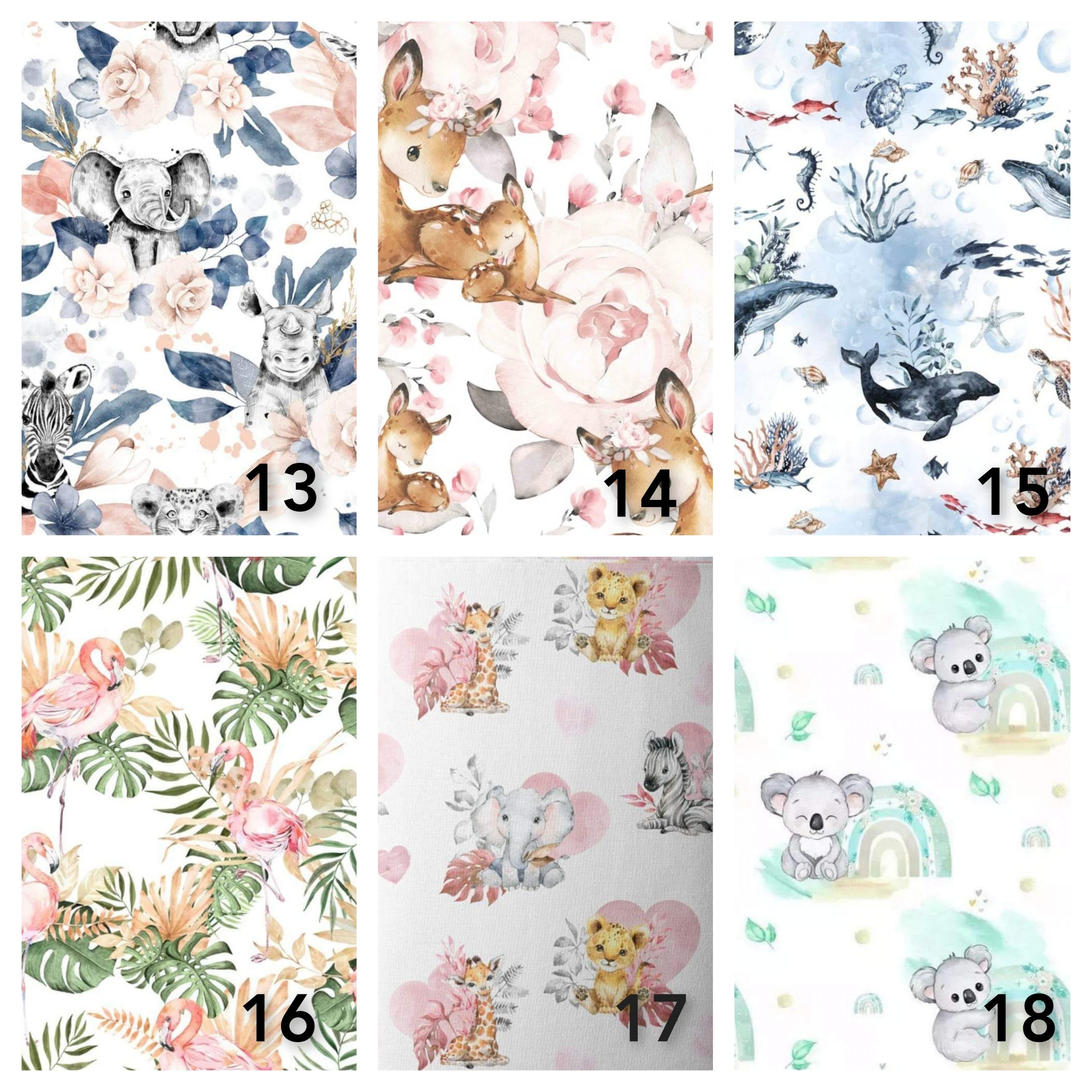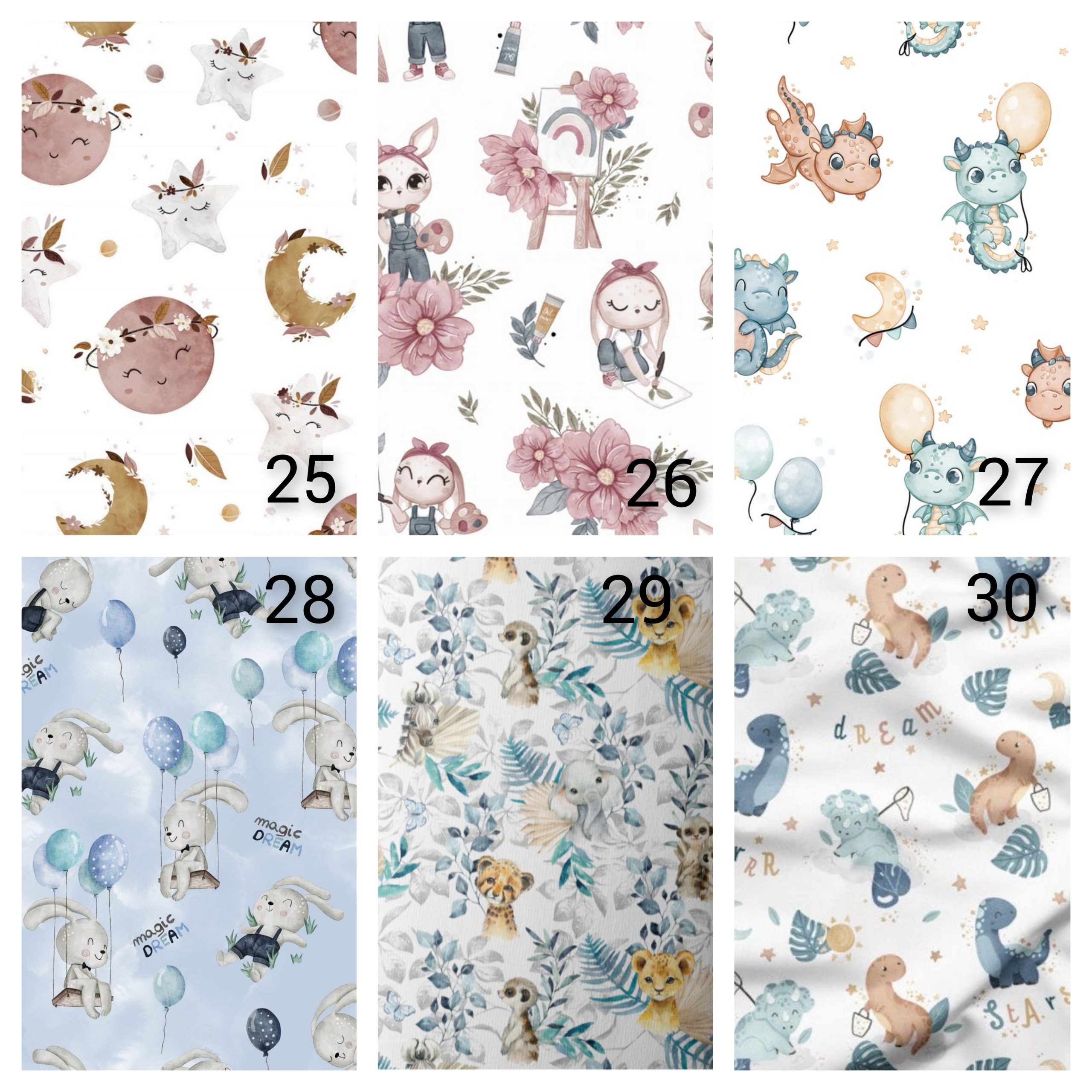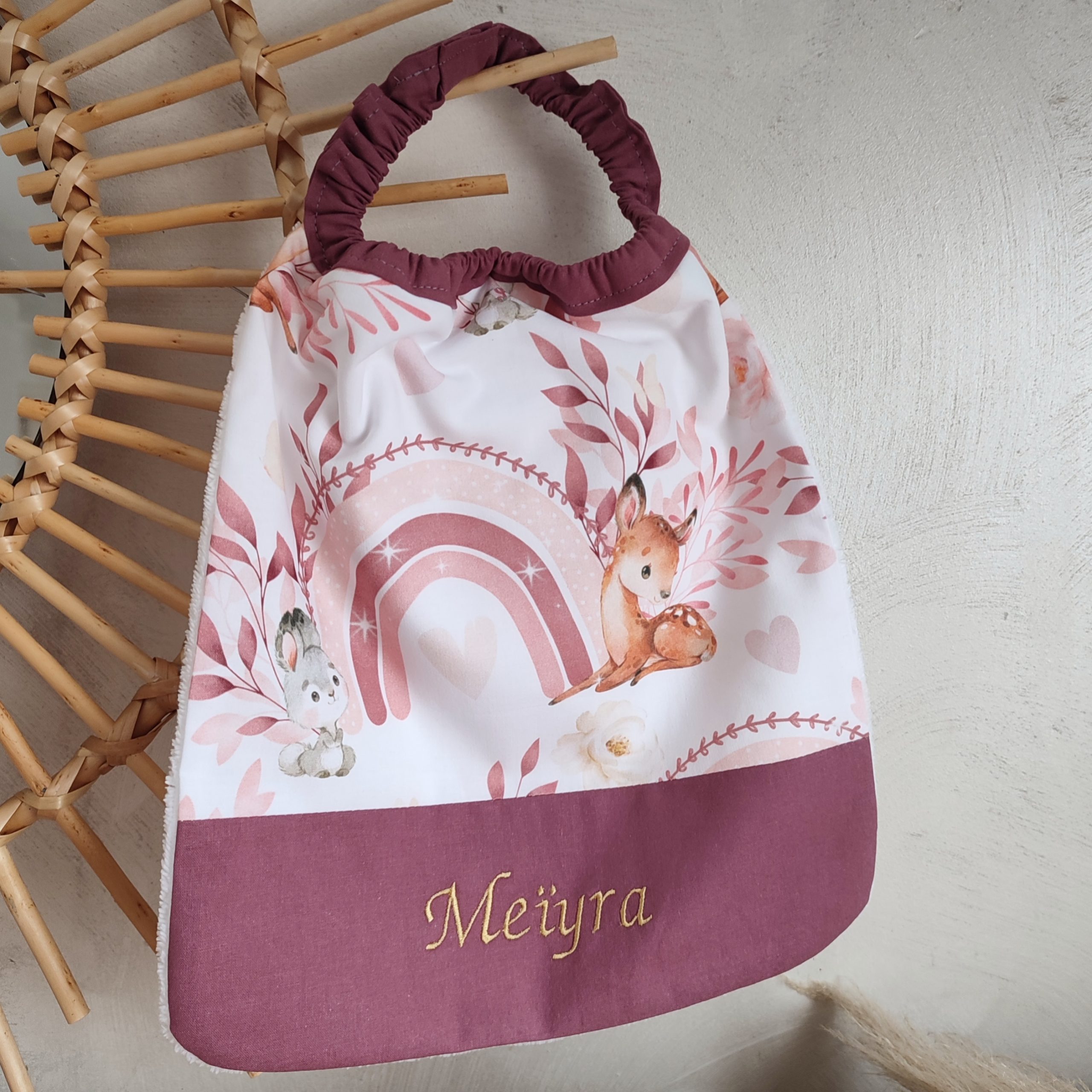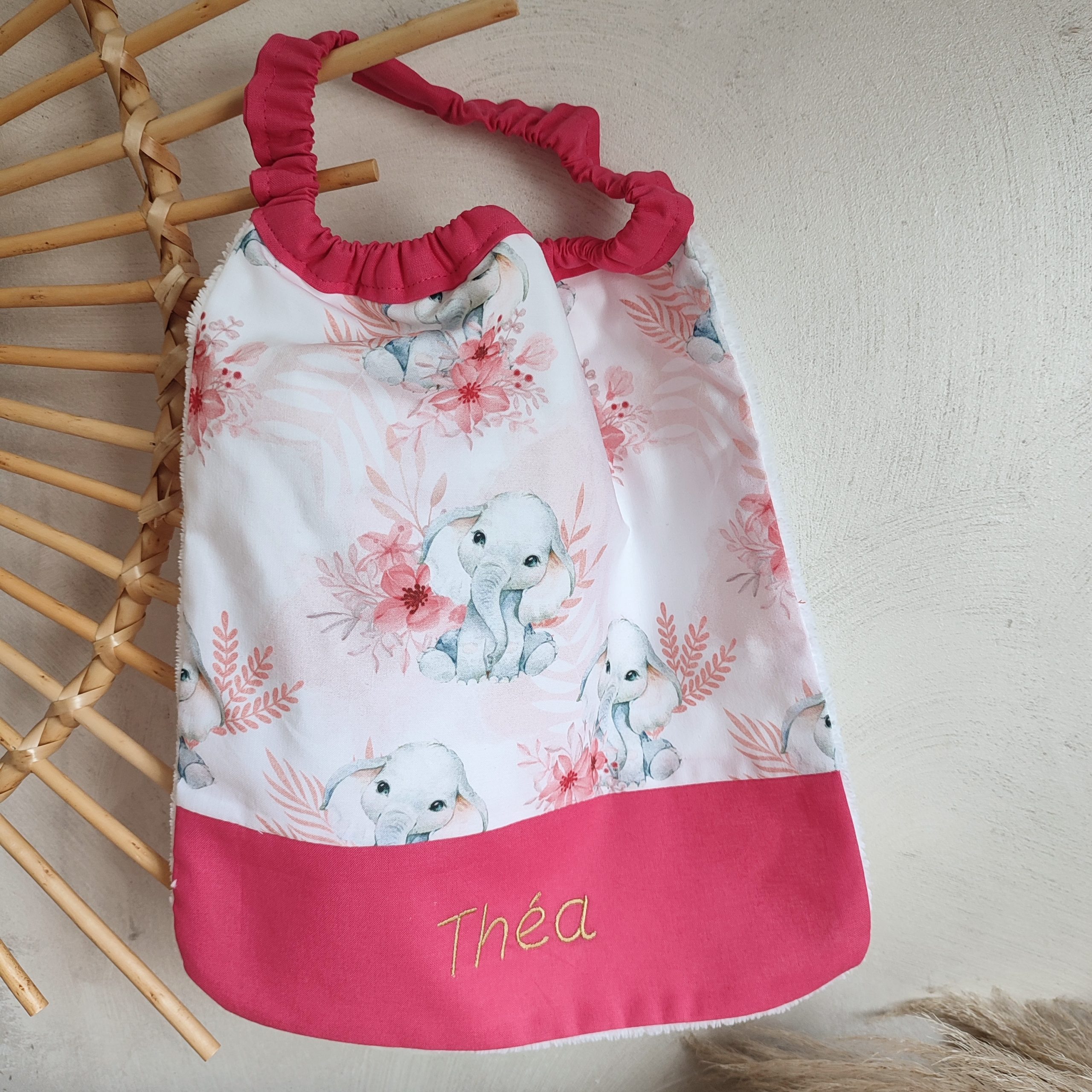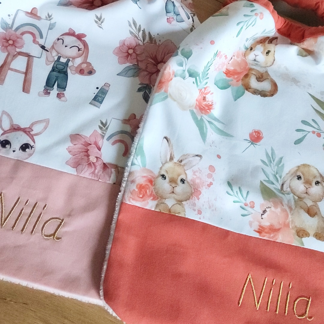 Une face en tissu à motif et uni où je brode le prénom si besoin, et de l’autre côté le tissu éponge de bambou très absorbant.